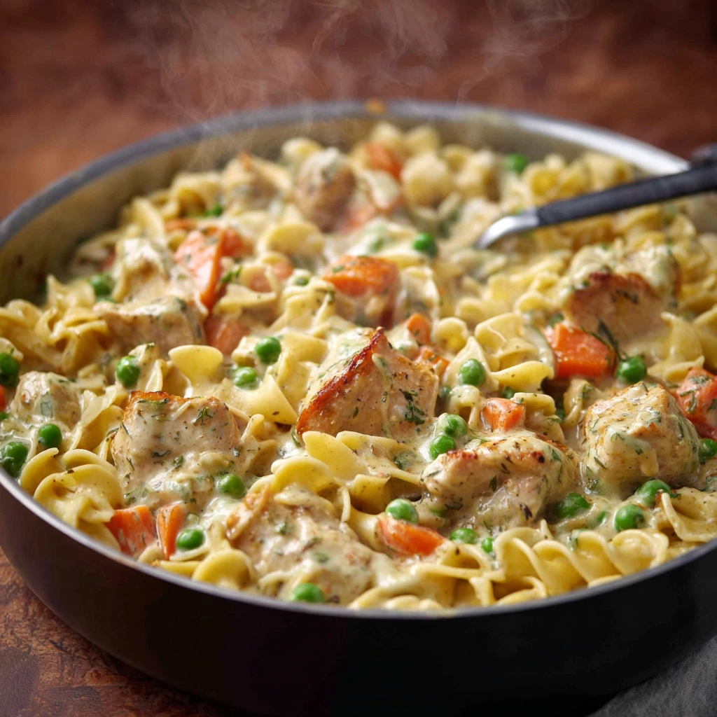 Delicious Quick Chicken Pot Pie Pasta with creamy sauce, tender chicken, hearty vegetables, and soft egg noodles.