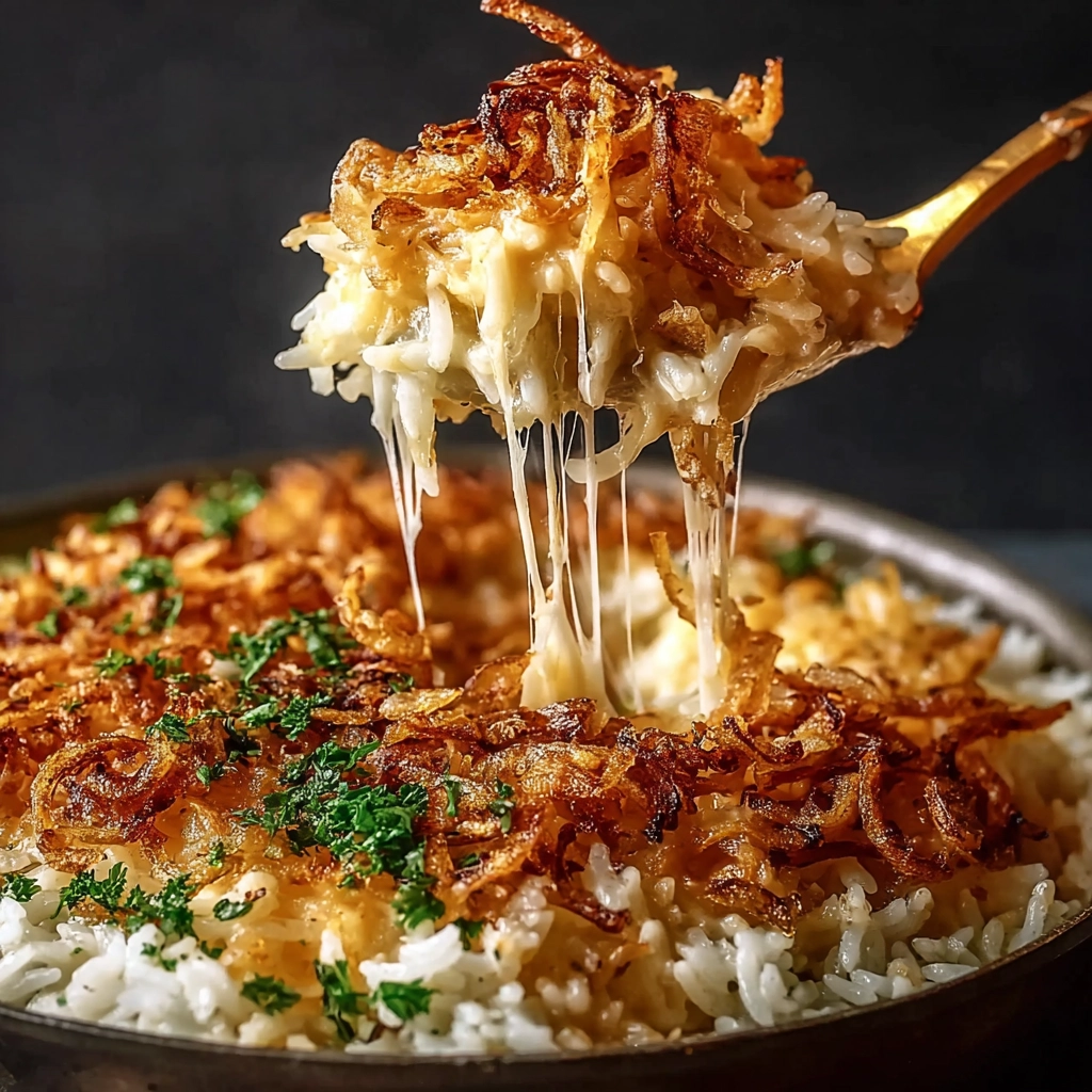 A comforting French onion chicken rice bake made with tender chicken, creamy rice, savory onion soup, and melted cheese for an easy family dinner.