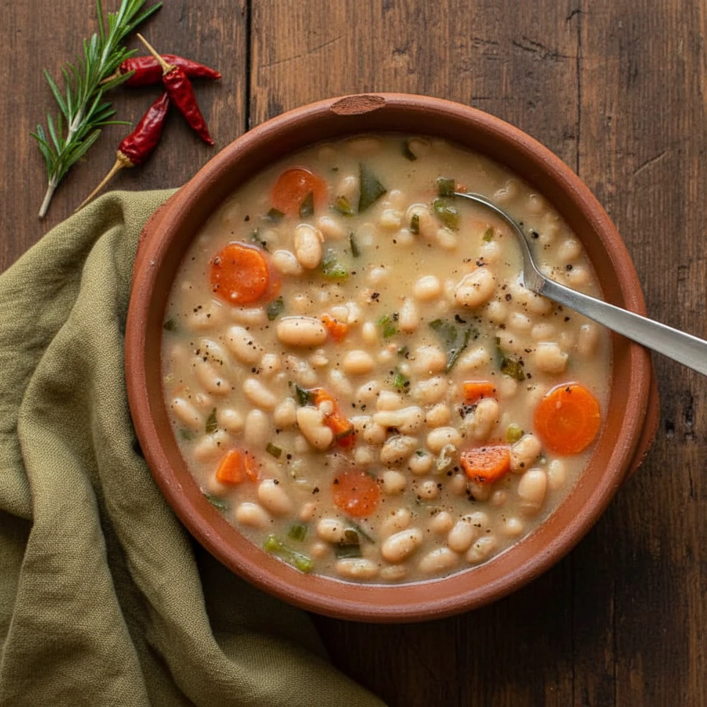 Use high-quality extra virgin olive oil because it forms the backbone of this recipe. Stir occasionally to release starch and create thickness naturally. For deeper flavor, replace part of the water with vegetable stock. If you prefer a thicker consistency, mash a small portion of beans directly in the pot and stir.
