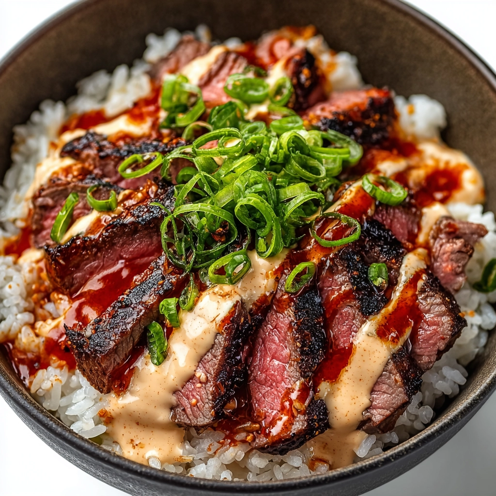 These savory Korean BBQ steak rice bowls are topped with a rich, spicy cream sauce for the ultimate fusion of flavors. Perfect for a quick weeknight dinner or a satisfying meal!