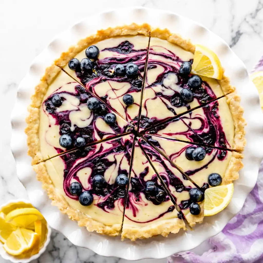 Creamy lemon tart layered with blueberry swirl and buttery shortbread crust, perfect for spring gatherings.