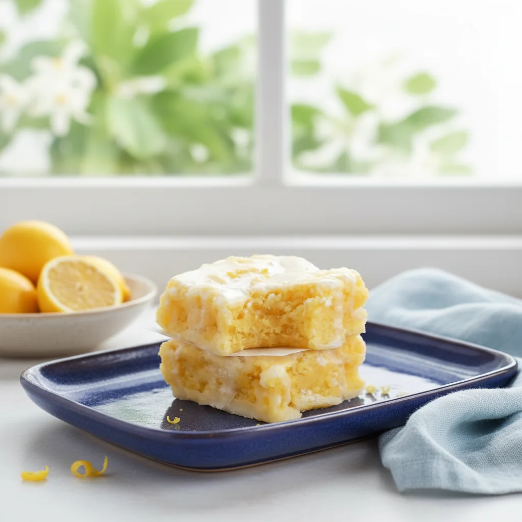 Soft and fudgy lemon brownies made with cake mix and topped with fresh lemon glaze. Bright, easy citrus dessert ready in 34 minutes.