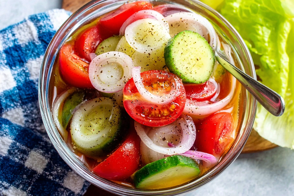 Growing up, this dish was always on our summer table, nestled between watermelon bowls and grilled chicken platters. My mom would prep it in the morning, and by dinner, the cucumbers were perfectly tangy and the tomatoes bursting with flavor. It was one of those “accidentally fancy” dishes that made guests feel special. Now, I make it whenever I need something light, bright, and nostalgic.