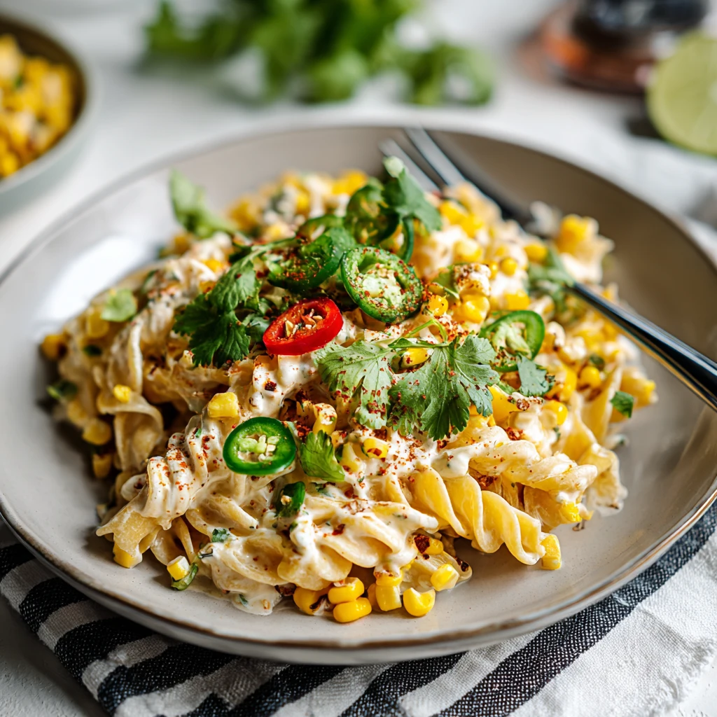Mexican Street Corn Pasta Salad with grilled corn, creamy lime dressing, and fresh herbs.