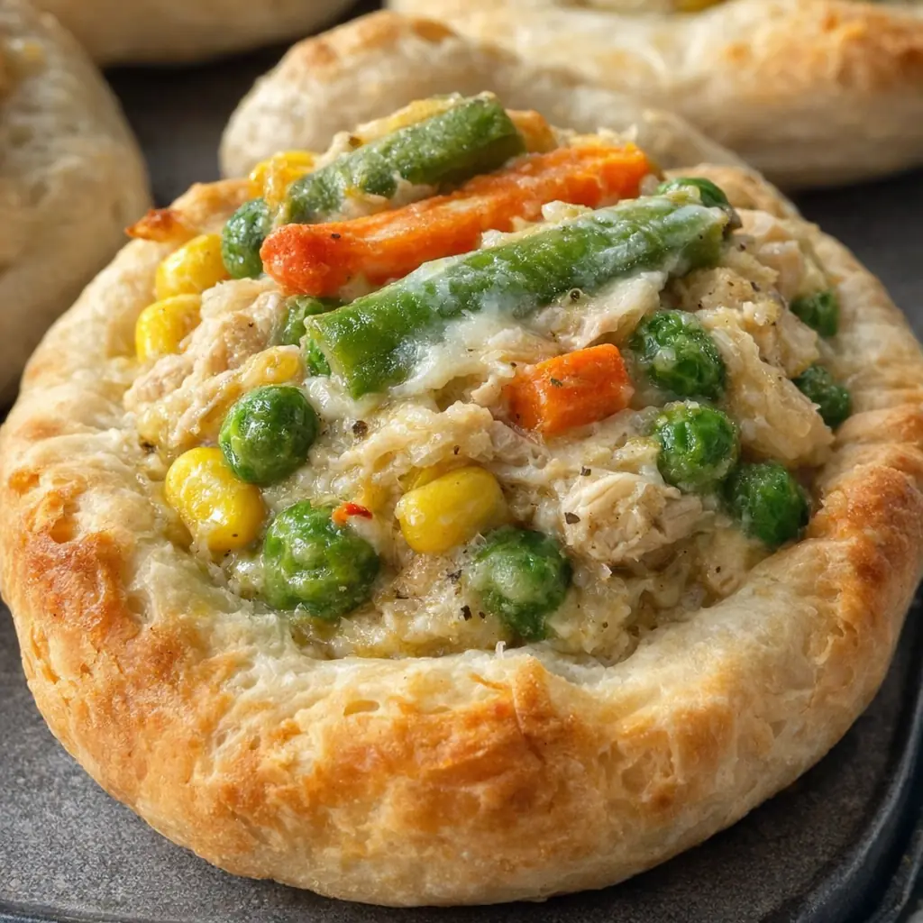 Spoon a generous amount of the chicken mixture into each biscuit cup. Gently pull the dough edges upward toward the center to form a shallow bowl shape. Bake for 20–22 minutes until the biscuits turn golden brown. Let the Mini Chicken Pot Pies rest for 5 minutes before removing them from the pan. Serve warm.