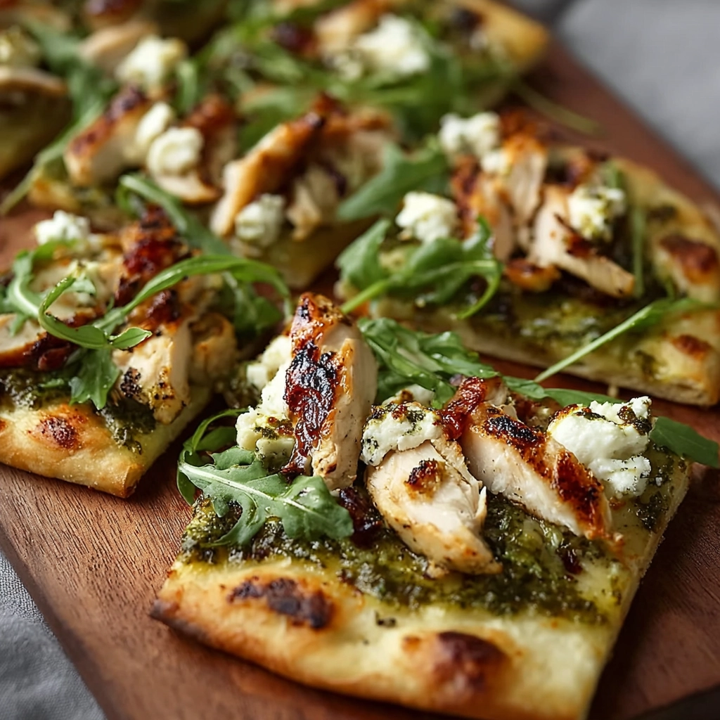 Enjoy a delicious Pesto Chicken Flatbread topped with juicy chicken, fresh basil pesto, and melted cheese. This quick and easy dish is perfect for lunch or dinner, offering a satisfying blend of flavors in every bite.