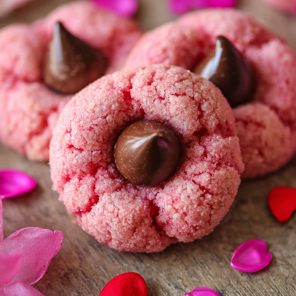 Soft, cake-mix-based pink cookies rolled in sanding sugar and finished with a classic chocolate kiss. Perfect for Valentine’s Day, parties, and kid-friendly baking.