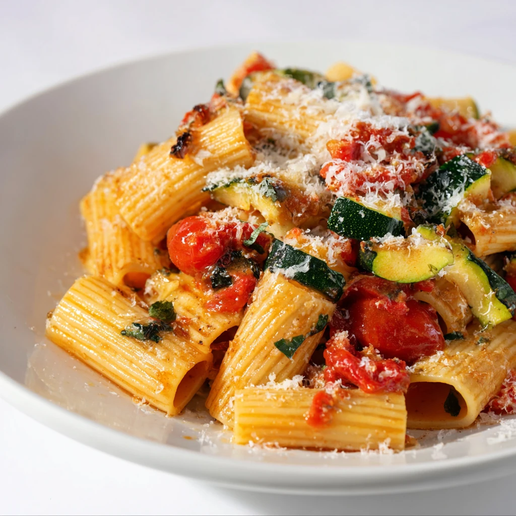 This dish works well for meal prep because the roasted vegetables hold their texture. Store portions separately and reheat gently to keep the pasta from drying out.