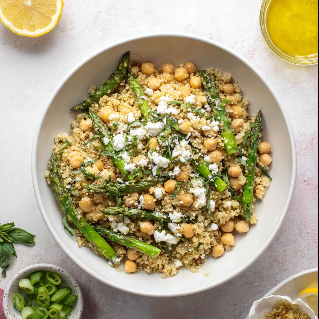 For deeper flavor, roast the asparagus until lightly caramelized and toast the pistachios if they are not already roasted. A generous mix of herbs adds brightness, while the lemon feta vinaigrette ties everything together with just the right balance of tang and richness.